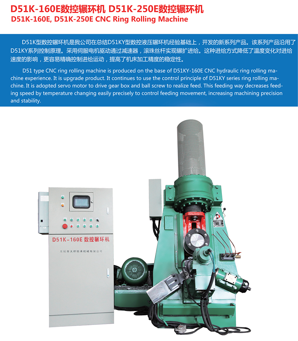 D51 type CNC ring rolling machine is produced on the base of D51KY-160E CNC hydraulic ring rolling machine experience.It is upgrade product.It continues to use the control principle of D51KY series ring rolling machine.It is adopted servo motor to drive gear box and ball screw to realize feed.This feeding way decreases feeding speed by temperature changing easily precisely to control feeding movement,increasing machining precision and stability.