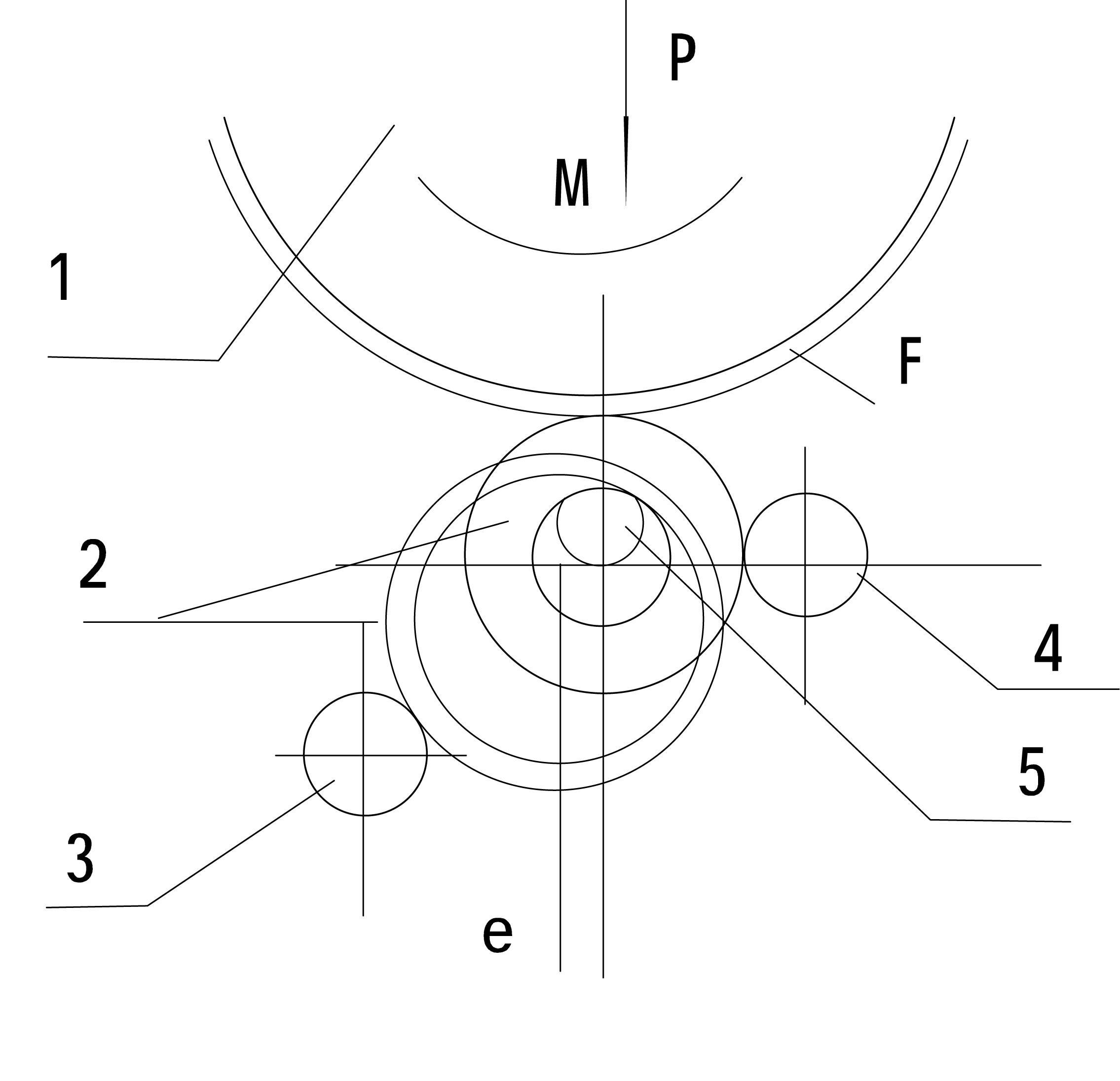 輾環(huán)機(jī)工作原理如上圖所示。溫度符合要求的環(huán)坯2套到輾壓輥5上,旋轉(zhuǎn)著的輾壓輪1在油缸力P的作用下向下運(yùn)動(dòng),與環(huán)坯接觸后,環(huán)坯開始變形。此時(shí)環(huán)坯和碾壓輥在摩擦力F的作用下旋轉(zhuǎn),環(huán)坯受到壓縮,壁厚逐漸減薄,金屬沿切線方向延伸(軸向也有少量展寬),環(huán)坯的延伸變形處于自由狀態(tài)。當(dāng)環(huán)坯外徑與固定的推力輥4接觸后,推力輥的反作用力使環(huán)坯外徑增大的同時(shí),產(chǎn)生彎曲變形,將環(huán)坯的幾何中心推向機(jī)器中心線的左方,并使輾擴(kuò)過程平穩(wěn)地進(jìn)行。當(dāng)環(huán)坯的外徑增大到予先調(diào)整好的信號(hào)輥3時(shí),輾壓輪即可向上回程,鍛件卸出,完成一次工作循環(huán)。